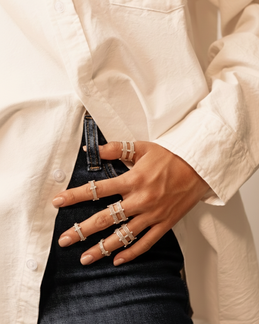 Un anillo doble acompañado de una argolla en filigrana que equilibra fuerza y delicadeza en una misma composición.